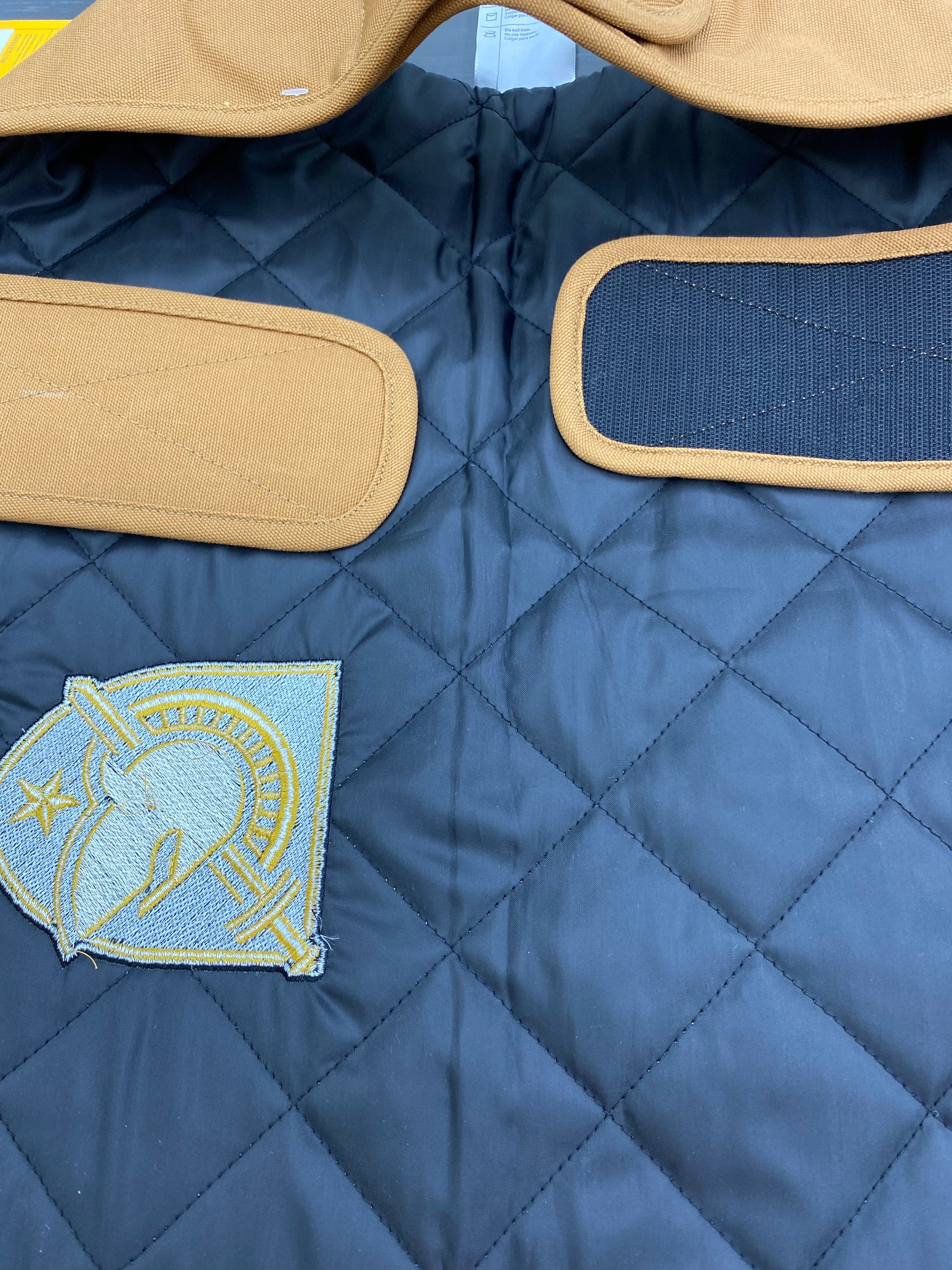- The quilted liner is a durable nylon with polyester batting for added warmth. Improved tabs at the neck and chest make it simple to take on and off